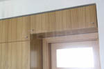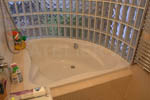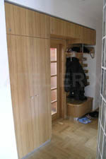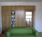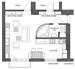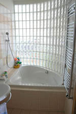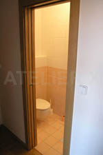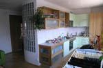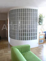 | Rekonstrukce staršího bytu s nešťastnou dispozicí – chodbou kolem jádra - mezi kuchyní a pokojem. Prostor uvolněn a zvoleno méně tradiční použití rohové vany a sklobetonových tvárnic.