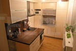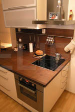 | Malá kuchyně s dostatkem pracovní plochy. Světlé lamino skříní tvoří dobrou podnož pro masivní ořechovou desku, která je ošetřena olejem. Poloostrov hluboký 100cm poskytuje dostatek prostoru pro práci i odkládání všeho potřebného.
