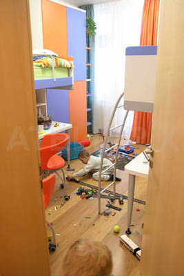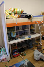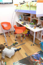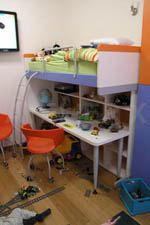 | V relativně malém pokoji slouží podlaha především k hrám. Proto byl zvolen systém paland, pod kterými jsou psací stoly.