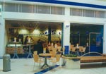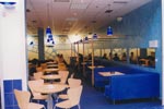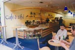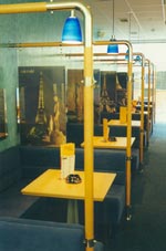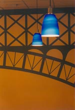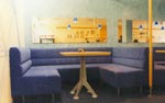| Interiér kavárny řešen včetně designu stolků – věží – i malby na zadní stěně. Kavárna posléze přemístěna v rámci objektu na nové místo, s jejím duchem a intimitou se to již nepodařilo.