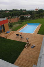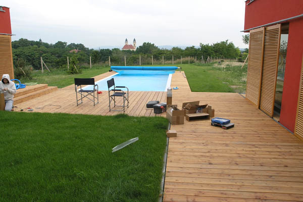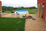 | Pobytové dřevěné terasy v atriu domu a kolem bazénu, vysuté molo nad hladinou jezírka, grilovaní přístřešek – to jsou stavební prvky doplňující zahradu přírodního stylu.