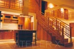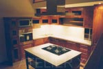 | Klasická kuchyně s rámečkovými dvířky v dýze olše. Varný ostrov směrem k jídelně otevřen, pro jeho optické odlehčení i možnosti uložení „pohledově atraktivních“ potravin. Též pod schody úložné skříňky