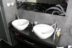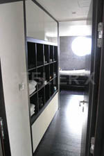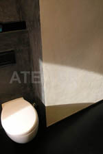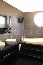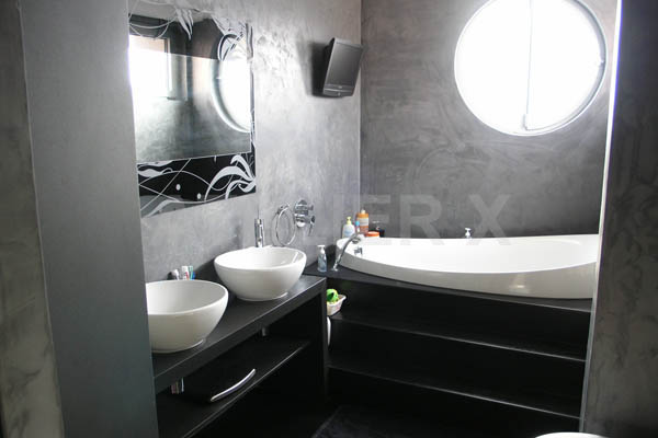 | Koupelna se šatnou dle posledních trendů – na stěnách stěrka v barvě šedé a smetanové, dřevěná podlaha včetně pódia se vsazenou vanou, stropní fólie dávající rovnoměrné teplé světlo.