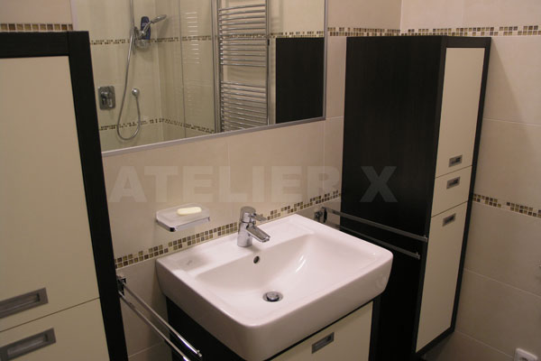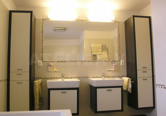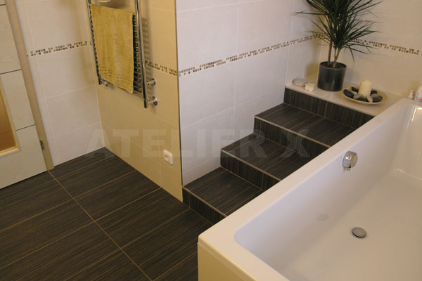 | Obklad světlého smetanového tónu v kontrastní kombinaci s dlažbou dezénu zebrano doplňuje decentní skleněná mozaika.