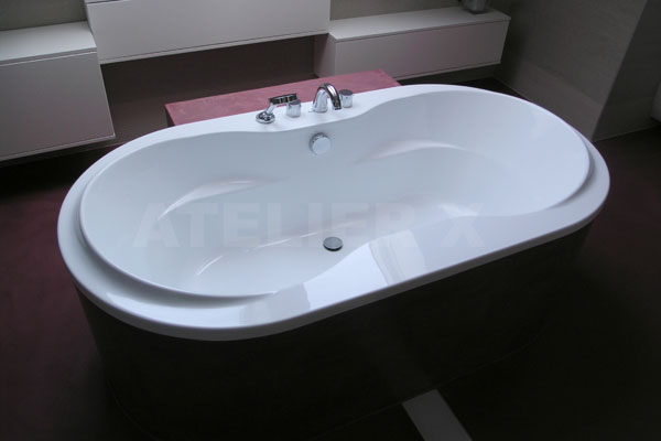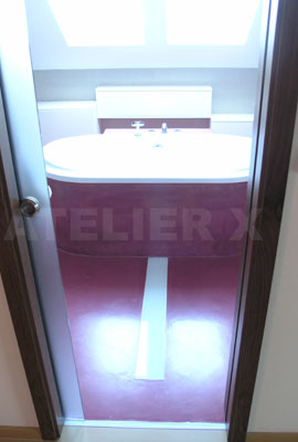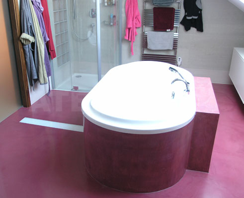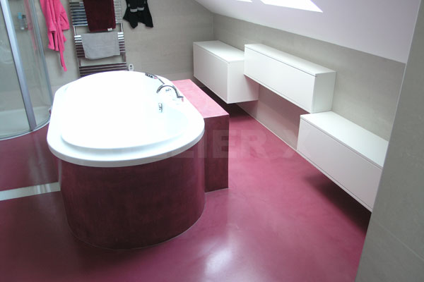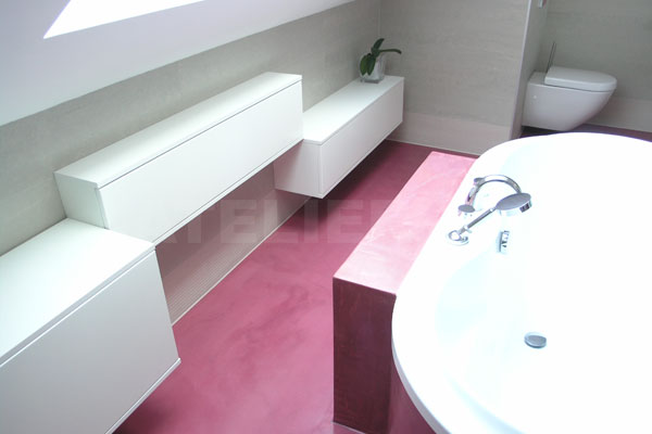 | Téměř futuristická koupelna s podlahou ve vínovém Pandomu v kombinaci s velkoformátovým obkladem v teplém šedém tónu.