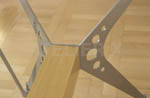 | Stůl pro 4 až 6 osob s dovnitř ubíhající konstrukcí nohou. Až průmyslově pojaté ocelové pásoviny spojeny s dřevěným hranolem „jen o málo větším“ než parkety v podlaze.