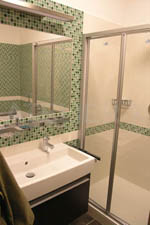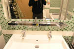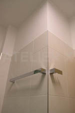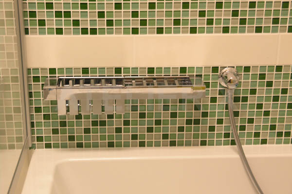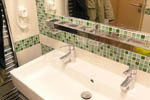 | Kombinace obkladu barvy slonové kosti a drobné skleněné mozaiky dává vyniknout luxusním koupelnovým doplňkům.
